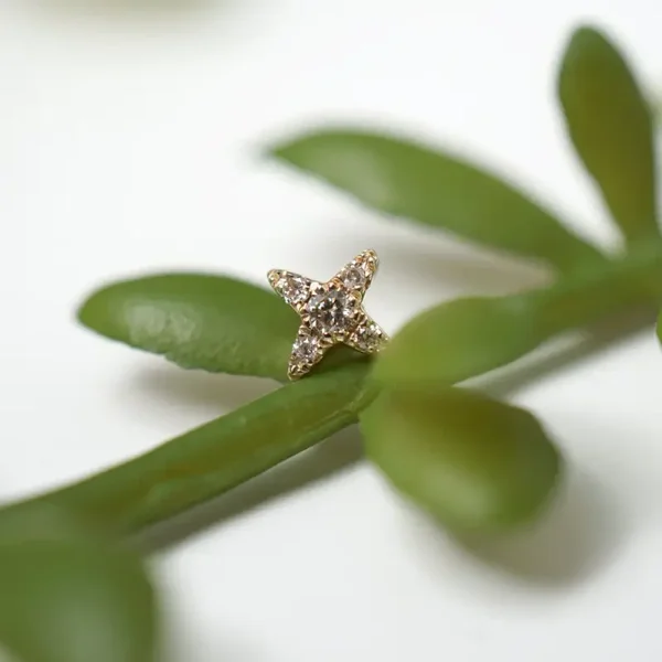 De verfijnde vierpuntige stervorm is bezet met sprankelende pavé-diamanten die bij elke beweging het licht vangen, perfect voor wie houdt van verfijnde details met een hemelse touch.